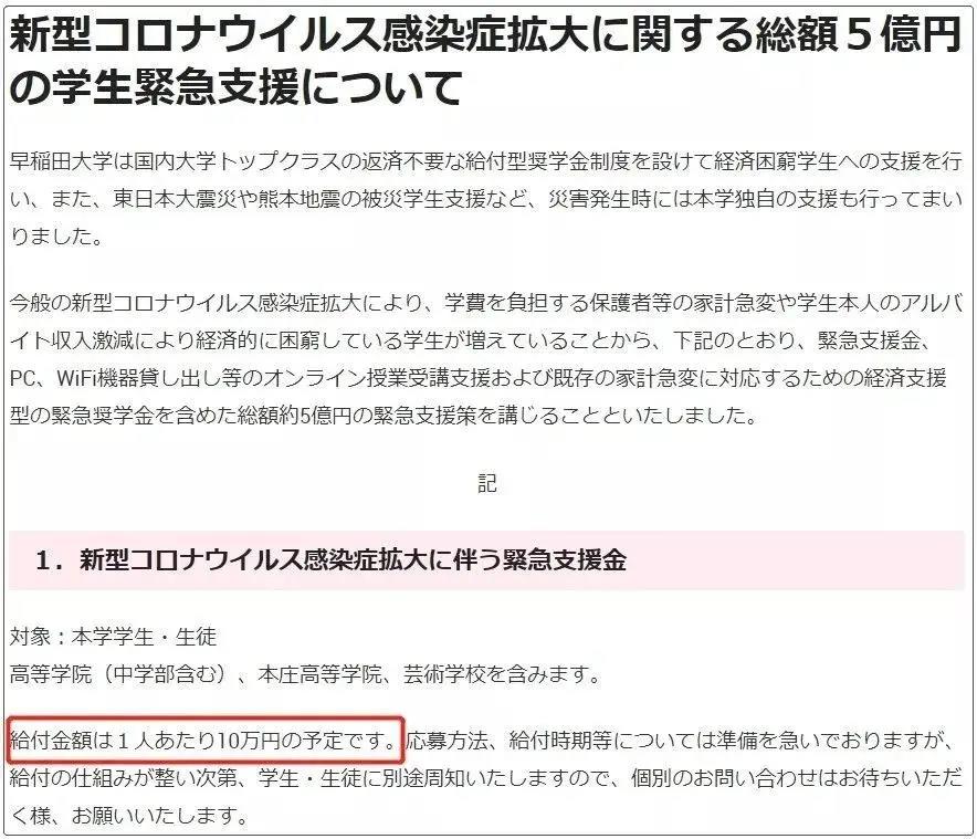 4月24日,早稻田大学在官网发布的最新新型肺炎对策显示:预计会为每名学生发放10万日元的紧急支援金!紧急支援金发放的对象包含了大学和大学院学生、初高中部、本庄高等学院以及艺术学校。