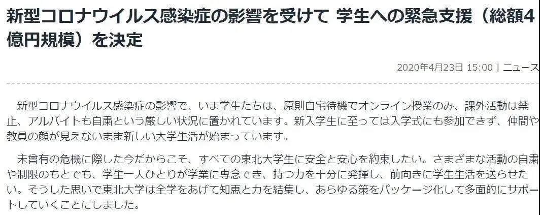 4月23日,东北大学发布消息,将会对学生给予紧急支援,支援金额达到4亿日元!
