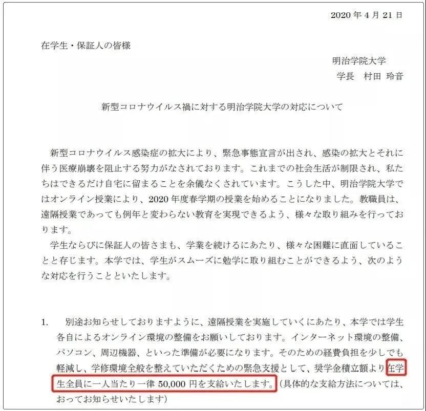 4月21日,明治学院大学在官网发布了新型肺炎对策,其中表明由于远程授课需要缴纳网费以及购买电脑等设备,会增加学生的经济负担,因此学校决定从奖学金准备金中作为补助金形式,为每名学生发放5万日元!