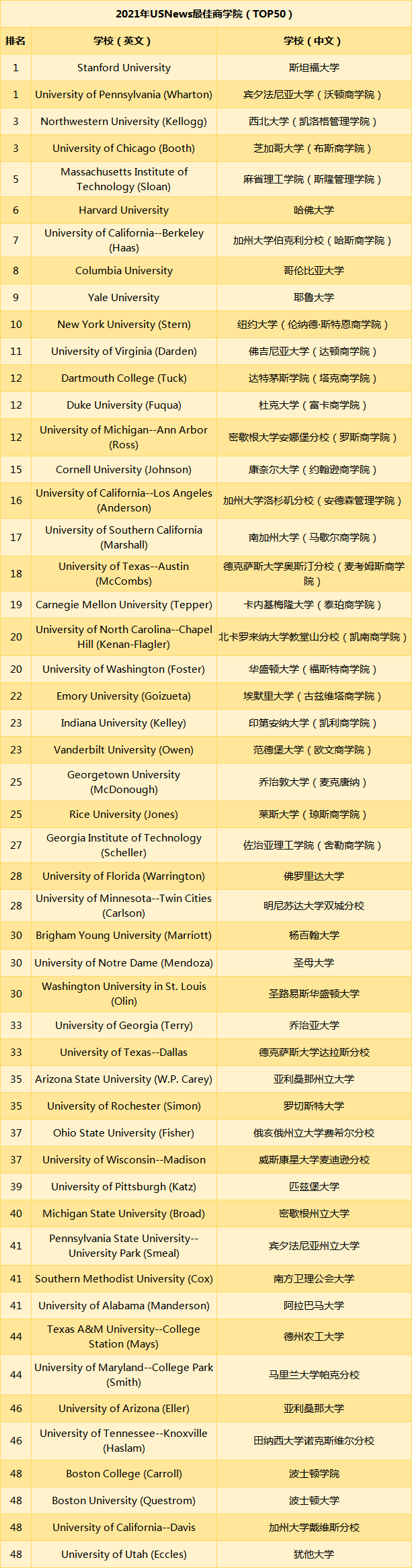 U.S. News从2019年秋季到2020年初,对美国477个由国际商业高等学校协会认可的MBA项目进行了调查,最终给131个MBA项目进行了排名。这131个项目为U.S. News提供了足够的数据,使得U.S. News能够利用自己定制的三大指标的加权平均值计算全日制MBA排名。