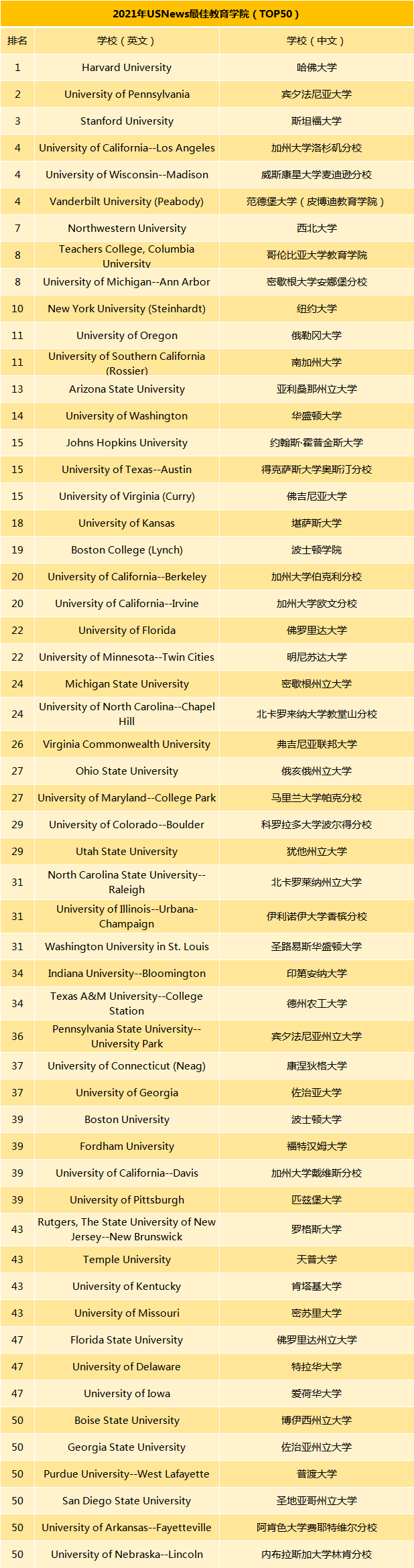 U.S. News将按照自己制定的四大项评估指标,总共包括十小项评估细则,来对这些数据进行加权平均数的计算,从而得出本年度最佳教育学院的排名。2021年最佳教育学院排名四大评估指标分别为:质量评估、学生录取条件、教学资源,以及科研活动。