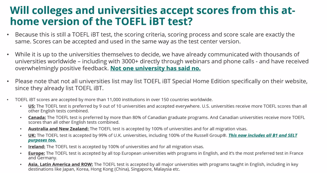 ETS已经和上千所学校进行沟通,最终结论是——“Not one university has said no”,也就是说在沟通的学校里面,没有学校拒绝申请者使用家庭版托福成绩申请。