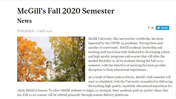 在官网上,麦吉尔大学表示:“大学将健康与安全作为首要考虑因素,但也在努力恢复正常的教学活动。为了让麦吉尔学生无论身在何处都可以开始或继续学业,2020年秋季课程将主要通过远程授课平台提供。”