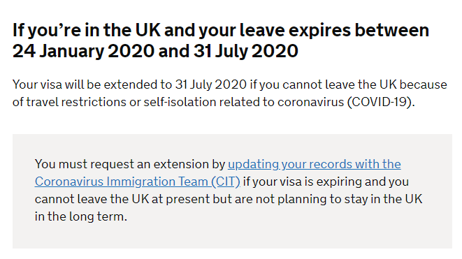 目前人在英国,签证截止日期在2020年1月24日到2020年7月31日之间的英国签证持有者,签证可以延期到7月31日。