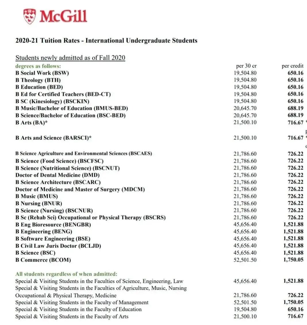 麦吉尔大学费用涨幅在3.1%左右,入读商科的国际学生学费已经突破5万加币,而另一热门专业国际学生的费用也接近5万加币。