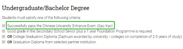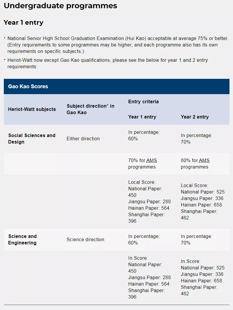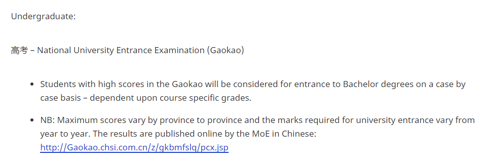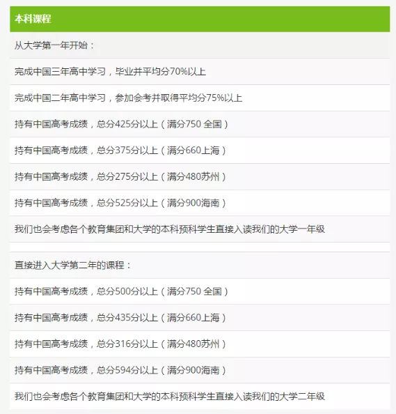 1.接受中国学生使用高考成绩直接申请大学一年级课程 。录取要求为高考成绩需至少达到总分的60%以上。