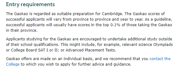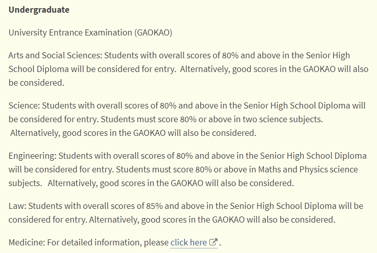1.接受北京,上海和广东地区高考生申请本科大一(Medicine不接受高考成绩申请),要求高考成绩达到80%。