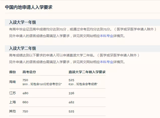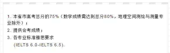 1.认可中国高考成绩:要求达到高考总分的75% ,不同专业对数理化的单项科目成绩有所不同。