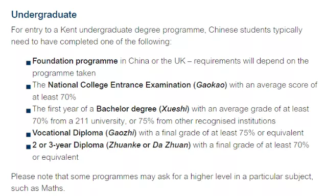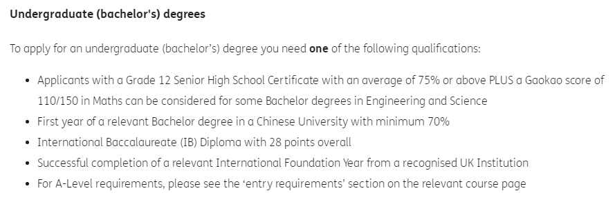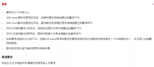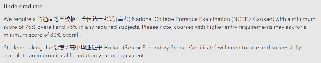 1.要求高考成绩75%以上,如果申请的专业有 A-Level数学要求,高考数学成绩则 80%以上。