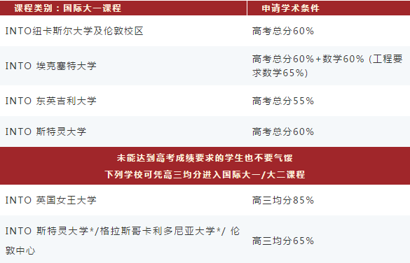 同时,相比于通过高考成绩直申本科,国际大一对高考成绩要求低一点,达到高考总分55%-60%就可以申请,当然分数越高,成功的机会越高。