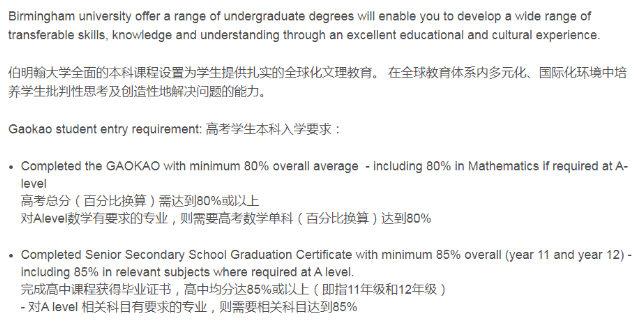 1.要求高考成绩80%以上,如果申请对A-level数学有要求的专业,数学则需达到数学总分的80%以上。