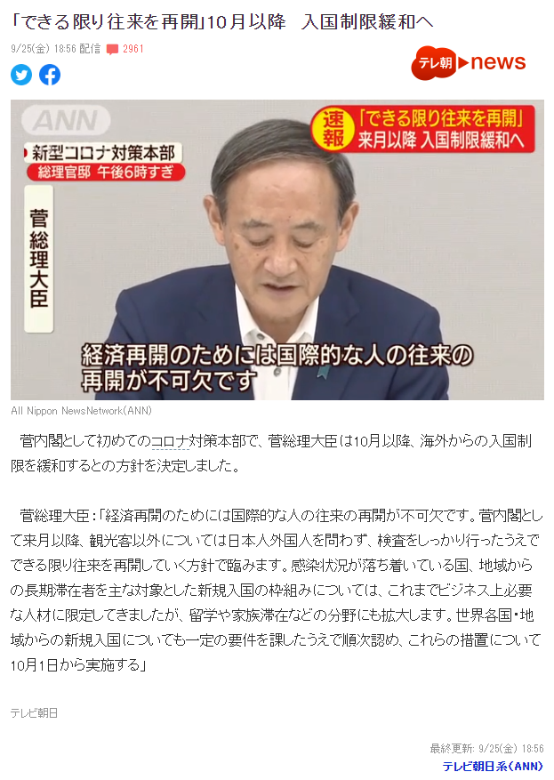 9月25日,朝日新闻报道,日本首相菅义伟,在上任后的首次内阁疫情会议中宣布 ↓