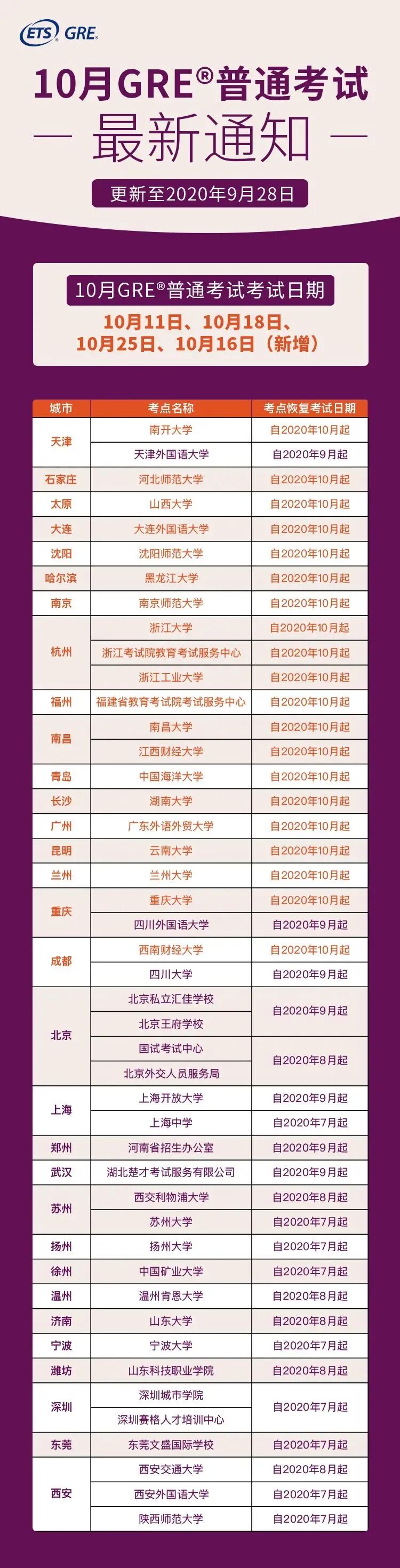 GRE®普通考试确认于10月在原有3个考试日期(10月11日、18日和25日)基础上,新增10月16日考试,并将新增恢复大连、广州、哈尔滨、石家庄、昆明、太原、长沙、杭州、南京、沈阳、福州、南昌、兰州、青岛等14座城市20个考点(大陆地区共计45个考点)。