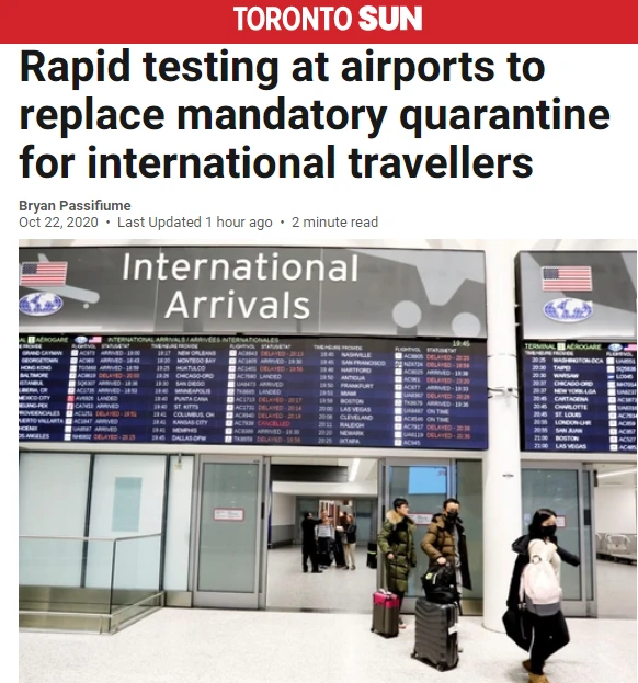 10月22日就有新闻透露,加拿大计划用快速检测 取代 强制隔离14天。