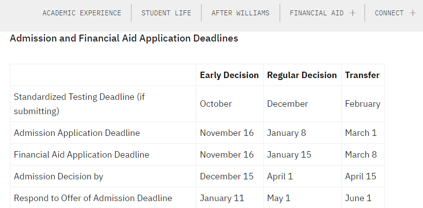 威廉姆斯学院延长ED截止时间到11月16日,12月15日放榜;RD截止时间从1月1日延长至1月8日,4月1日放榜。
